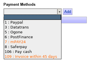 - No payment methods are selected. The customer can pay by all default configured payment methods, except the for selected customers only methods.
